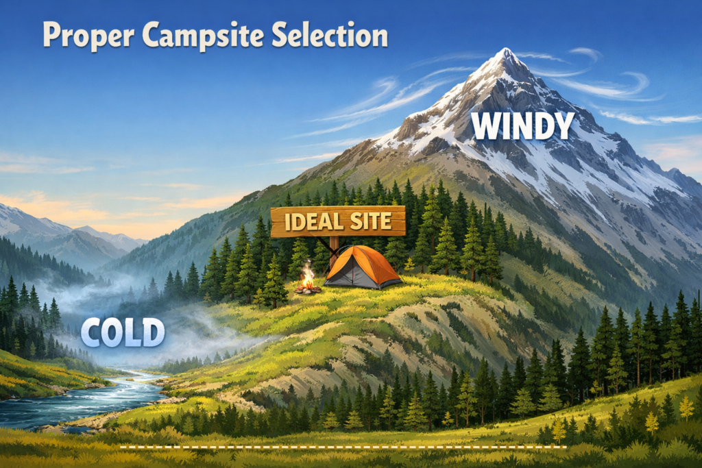 - Avoid Valley Bottoms: Cold air is dense and settles in low depressions and valley floors. Sleeping here guarantees a freezing night.