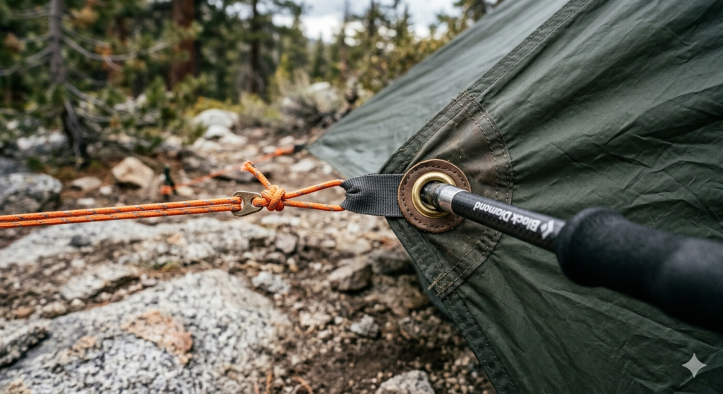 - Insert the Front Pole: Move to the front. Insert your second trekking pole (set higher than the rear) into the front center tie-out. Pull the front guy line taut and stake it down.